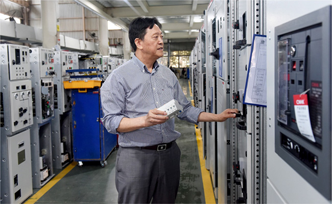 一大早,陈福梯坐在办公室里,跟公司经营班子成员共同讨论新研发的环保型充气环网柜和固体环网柜的市场布局情况。陈福梯在企业一线奋斗了40余年,虽已年近70岁,但从他忙碌的身影中总能感受到创业的激情。