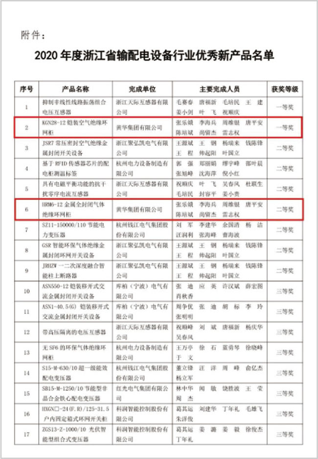 黄华集团总裁陈志浩先生荣膺“第四届浙江省输配电设备行业优秀企业家”荣誉称号,黄华集团有限公司新开发的KGN28-12恺装空气绝缘环网柜、HRM6-12金属全封闭气体绝缘环网柜分别荣获“2020年度浙江省输配电设备行业优秀新产品”一等奖和二等奖。