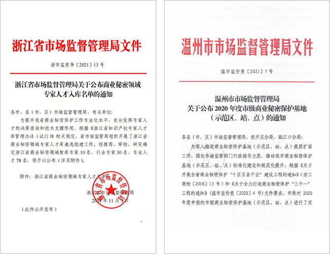 浙江省市场监督管理局公布2021年度浙江省商业秘密保护示范区、示范站(点)建设情况,伊发控股集团有限公司成功荣获2021年度浙江省商业秘密保护示范基地称号。集团常务副总孔莉成功入选浙江省商业秘密专家人才库。